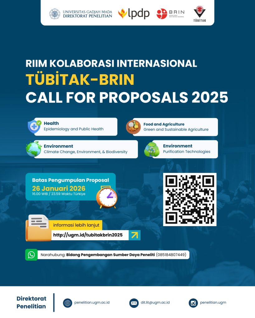 2. The Principal Investigator (PI) Indonesia wajib menyampaikan usulan proposal beserta dokumen pendukung sampai dengan tanggal 26 Januari 2026 pukul 16.00 WIB melalui sistem pendanaan BRIN http://ugm.id/RIIMTUBITAK serta mengirimkan CC kepada email dit.lit@ugm.ac.id