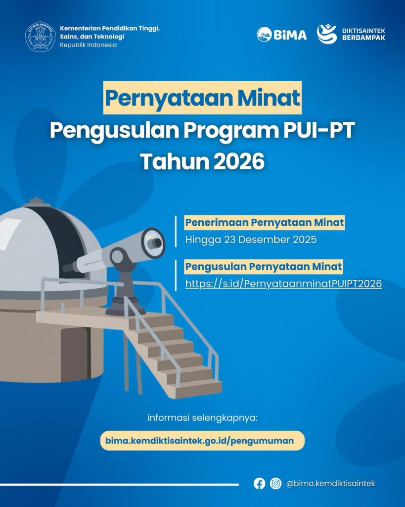 Direktorat Penelitian dan Pengabdian kepada Masyarakat, Kemdiktisaintek membuka Penerimaan Proposal Program Penguatan Ekosistem Riset dan Inovasi PUI-PT bagi Lembaga PUI/Pusat Studi/Pusat Riset/sebutan lainnya di Perguruan Tinggi, yang belum pernah menerima pendanaan dari Kemdiktisaintek untuk program PUI-PT, untuk mengajukan pendanaan pada Tahun Anggaran 2026 dengan terlebih dahulu mengajukan pernyataan minat